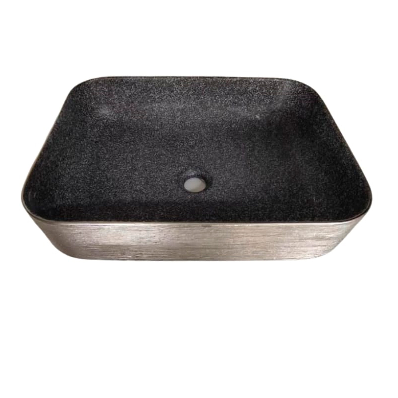 Lavabo rettangolare soprapiano bicolore in platino, misure 51,4 cm x 40 cm x 13,5 cm, senza foro troppo pieno. Materiale porcellana, finiture platino.