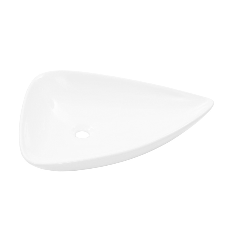 Lavabo soprapiano triangolare, misure 65 cm x 47 cm x 12 cm, senza foro troppo pieno. Materiale porcellana, finiture bianco lucido.