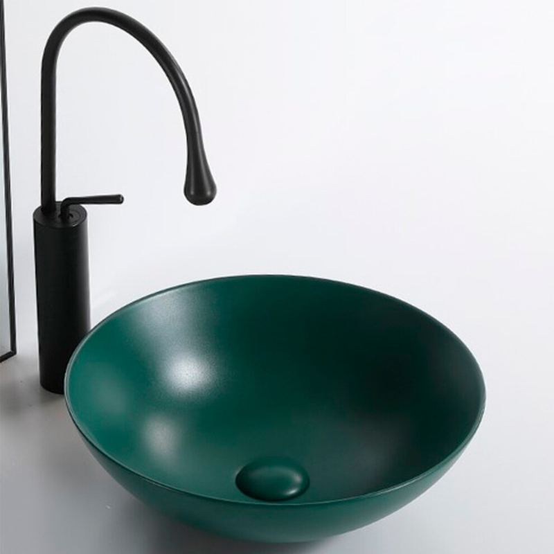 Lavabo soprapiano rotondo, misure 40 cm x 40 cm, senza foro troppo pieno. Materiale porcellana, finiture verde smeraldo opaco