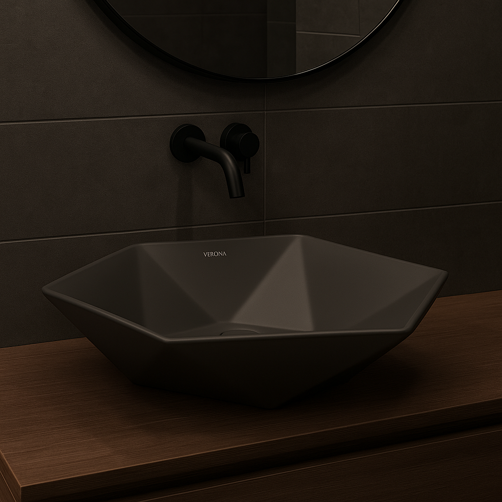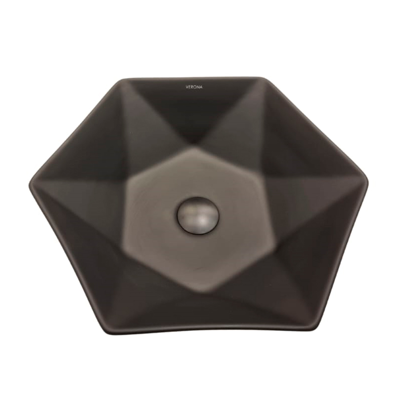 Lavabo soprapiano diamantado, misure 48 cm x 42 cm x 13 cm, senza foro troppo pieno. Materiale porcellana, finiture nero opaco.