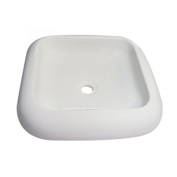 Lavabo triangolare soprapiano, misure 66 x 44 x 14,5 cm, senza foro troppo pieno.Materiale in porcellana, finire bianco lucido.