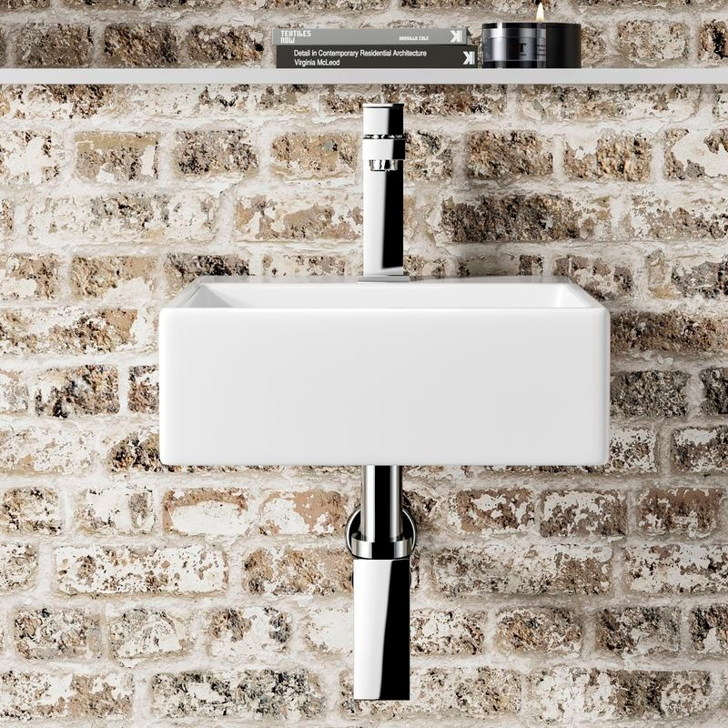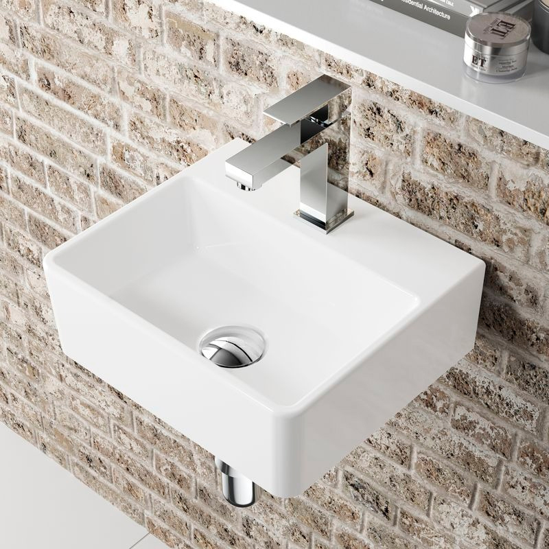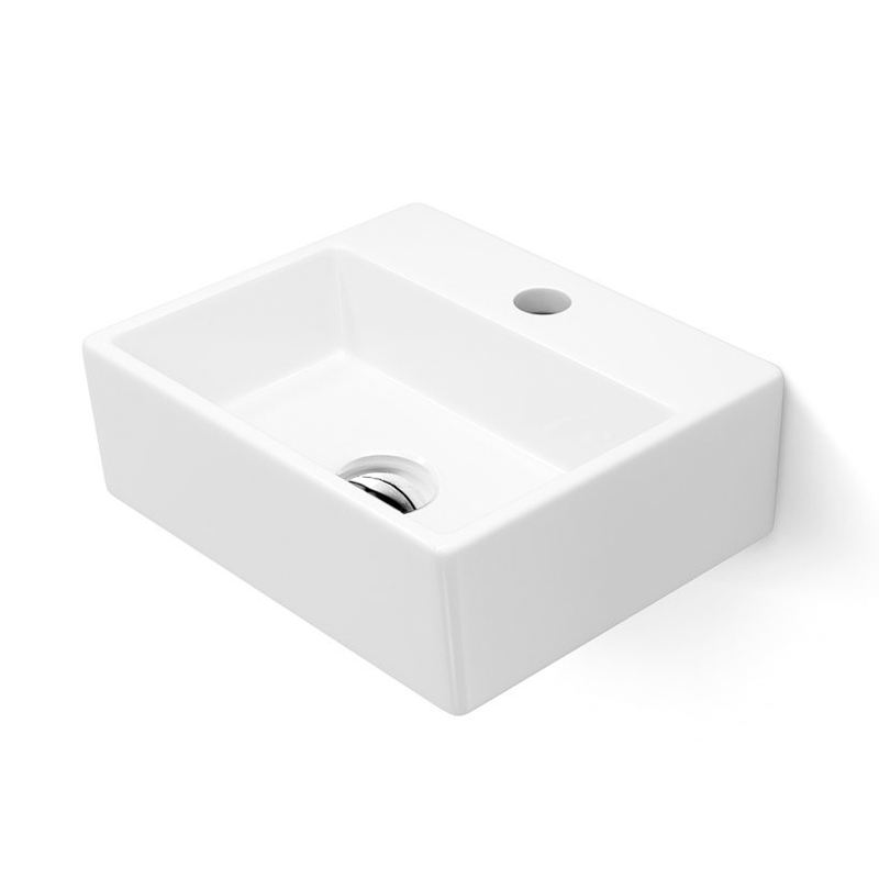 Lavabo sospeso quadrato, misure 29 cm x 34 cm x 11,5 cm, senza foro troppo pieno. Materiale porcellana, finiture bianco lucido.