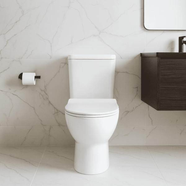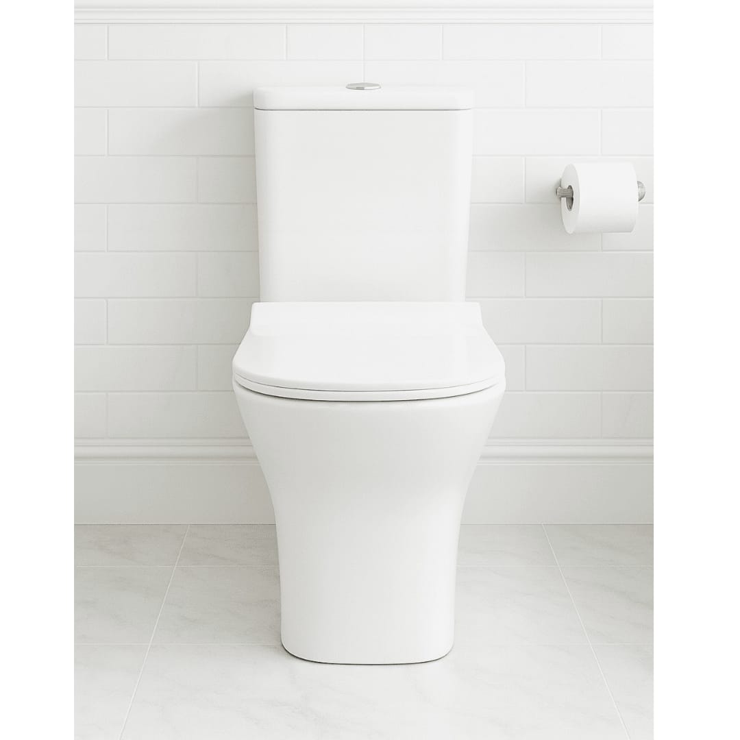 W.C. a pavimento a due pezzi con scarico a 30 cm. Con sistema a doppio scarico da 3 e 6 litri e potente pulizia a 360° per garantire un lavaggio completo della tazza. Sedile a chiusura rallentata, con sistema di sgancio rapido per una facile pulizia. Materiale in ceramica vetrificata, finitura bianco lucido